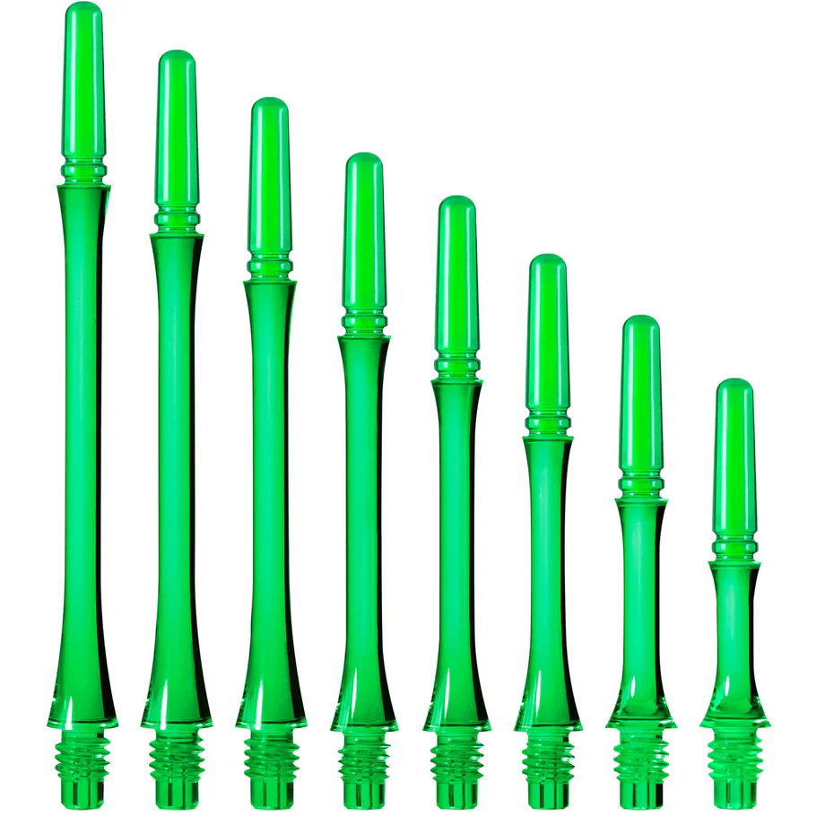 Cosmo Fit Shaft Gear in green are made from a polycarbonate resin to strengthen the stem at both the screw thread and the base of the top. These size 1 spinning green stems have a rounded top to allow the flight to rotate and the slim stem profile is concave in the centre of the stem, before widening where it meets the flight. The given length of these size 1 green stems is what is visible when the dart is fully assembled.