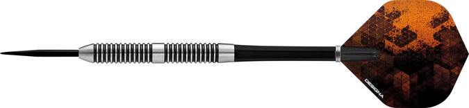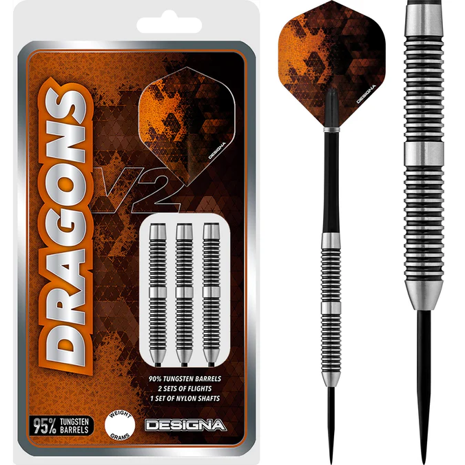 (D) Designa Dragon 95 V2 Steel Tip Darts – 95% Tungsten. Quality 95% Tungsten Darts with a distinctive Ringed grip. Includes: 2 Sets of Designa Flights, 1 Set of Nylon Shafts with rings, Point Protector.