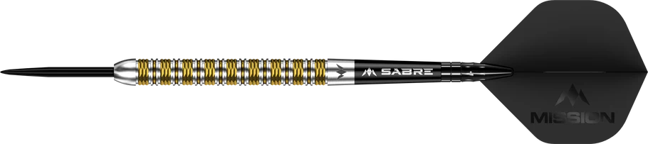 Mission Kinsuji Darts – Steel Tip – 95% Tungsten. Up your game with the Mission Kinsuji Darts! Translated from Japanese as โgold lineโ, Kinsuji is considered to be the mark of high-quality craftsmanship often found on well-forged swords. These darts are made of a premium 95% tungsten material and are complete with a luxurious gold PVD coating on the barrels. This straight 55m barrel includes a lengthy section of alternating cuts going round the barrel, providing players with an excellent amount of grip. There is a small smooth section at the rear of the barrel with a laser-etched Mission logo, while the front of the barrel includes a smooth bull nose that leads to a smooth black point. The Kinsuji dart is complete with a set of short black Mission Sabre shafts that tightly grips the Mission Kinsuji flight. Available in steel tip (22g, 24g and 26g).