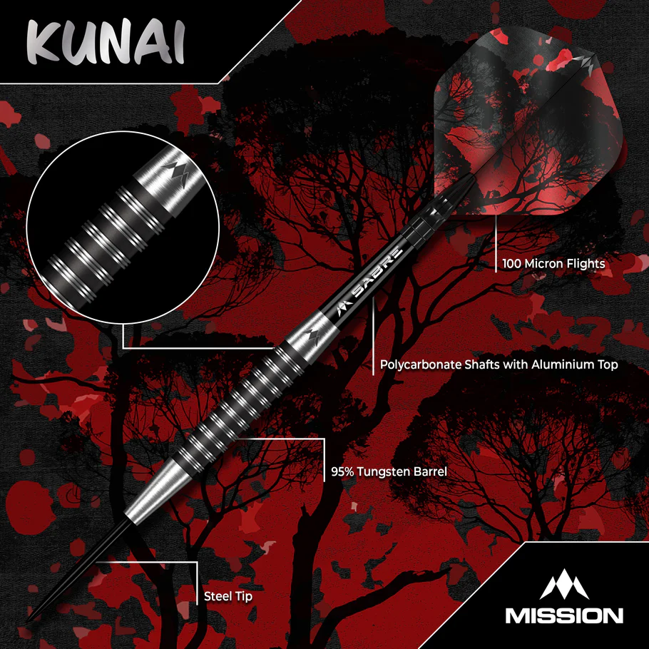 The Mission Kunai Darts are the weapon of choice for players of all levels! Inspired by the Japanese multi-purpose tool, these darts are crafted from a premium 95% tungsten material and are complete with a black PVD coating on the barrels. The centre section of the fully contoured barrel features a fine aggressive grip which includes a lengthy section of natural tungsten interspersed with a black PVD coating, making them ideal for players who prefer a dart with lots of grip. The front section of the barrel features a smooth tapered nose, which leads to a smooth black point. At the rear of the dart is a short smooth section with a laser-etched Mission logo. The Kunai dart is complete with a set of short black Mission Sabre shafts which tightly grips the signature Mission Kunai flight. Available in steel tip (23g and 25g) and soft tip (19g).