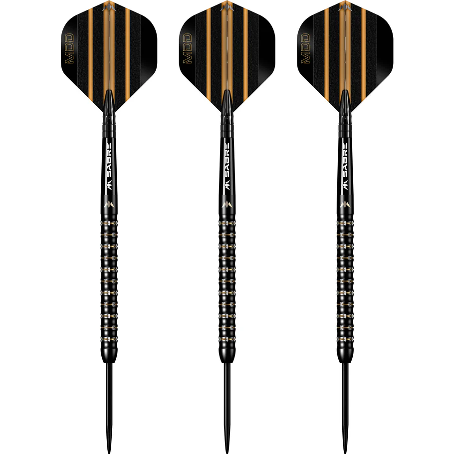 Be the real deal on the oche with the Mission Mike De Decker Black & Gold PVD Tungsten Darts. Made from a high grade 95% tungsten material, and with a black PVD coating and gold painted rings on the barrel, these darts have a premium look and feel to them. This straight barrel dart includes a ring grip with a black PVD coating that is interspersed with gold rings and milled cuts along the barrel to offer players plenty of grip. The rear of the barrel has a smooth section with the laser-etched Mission logo, while the front of the barrel consists of a smooth bull nose that leads to a black point. De Deckerโs premium dart in this range is complete with a set of black Mission Sabre shafts with black tops and his own signature flights in a black and gold design. Available in steel tip and soft tip.