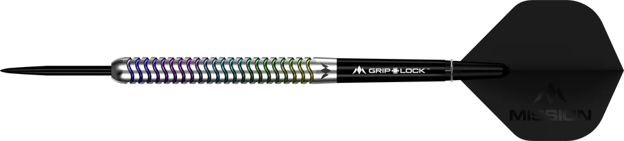 Mission Mirage Darts – Steel Tip – 90% Tungsten. Distort reality with the Mission Mirage Darts! The groove pattern and coral PVD coating on these darts creates a mirage-like illusion as you turn them. The Mirage dart is made from 90% tungsten and features a striking pattern along almost the entire barrel. There is a small smooth section at the rear of the barrel with a laser-etched Mission logo, while the front of the barrel includes a smooth bull nose that leads to a smooth black point. The Mirage dart is complete with a set of tweenie black Mission GripLock shafts and Mission Mirage flights. Available in steel tip (23g and 25g) and soft tip (20g).