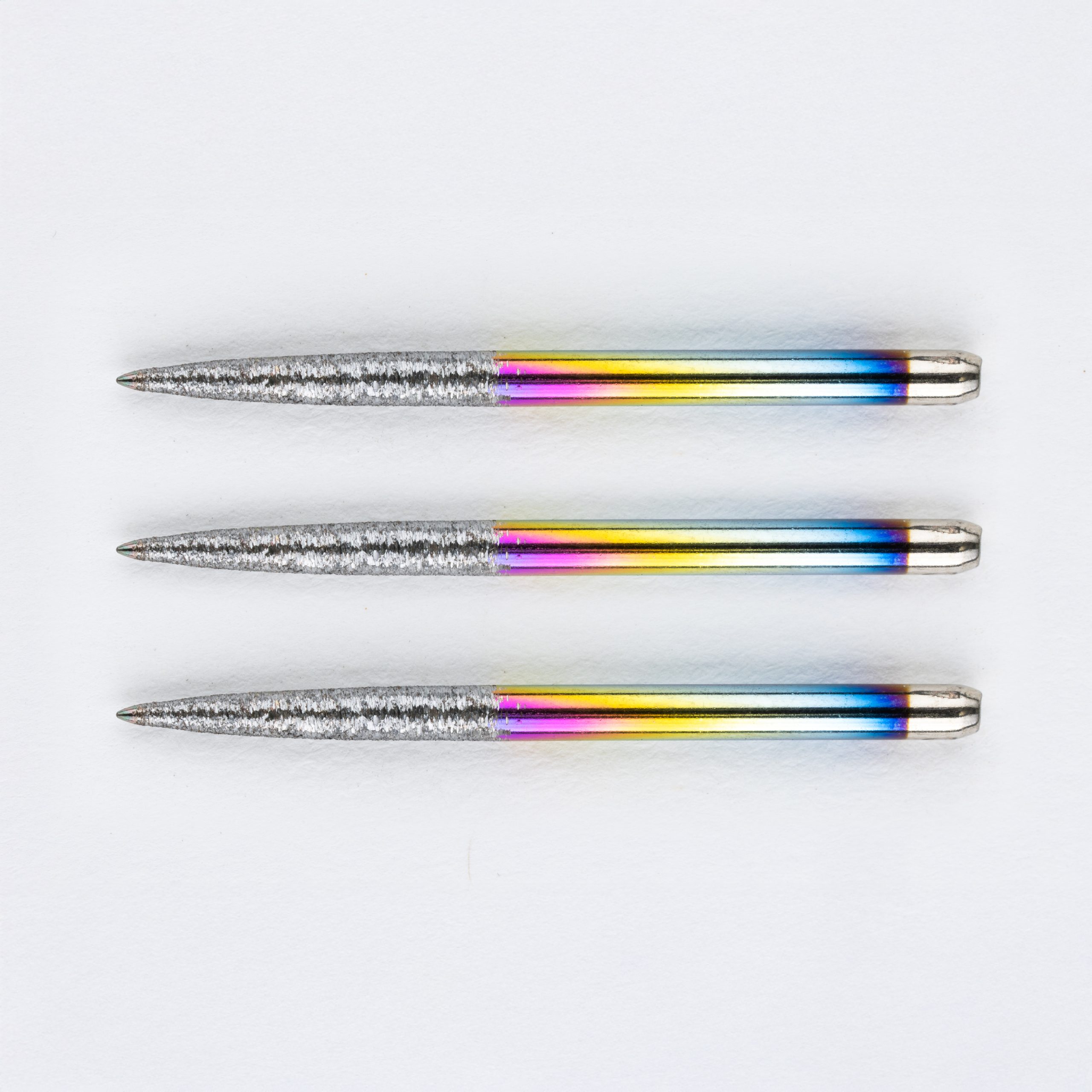 The Punk Psycho points were released in April 2025 and have been a huge hit. They are a multi-coloured rainbow finish on the top half and a delinquent edge. Can also be make them with an Anarchist edge on request.