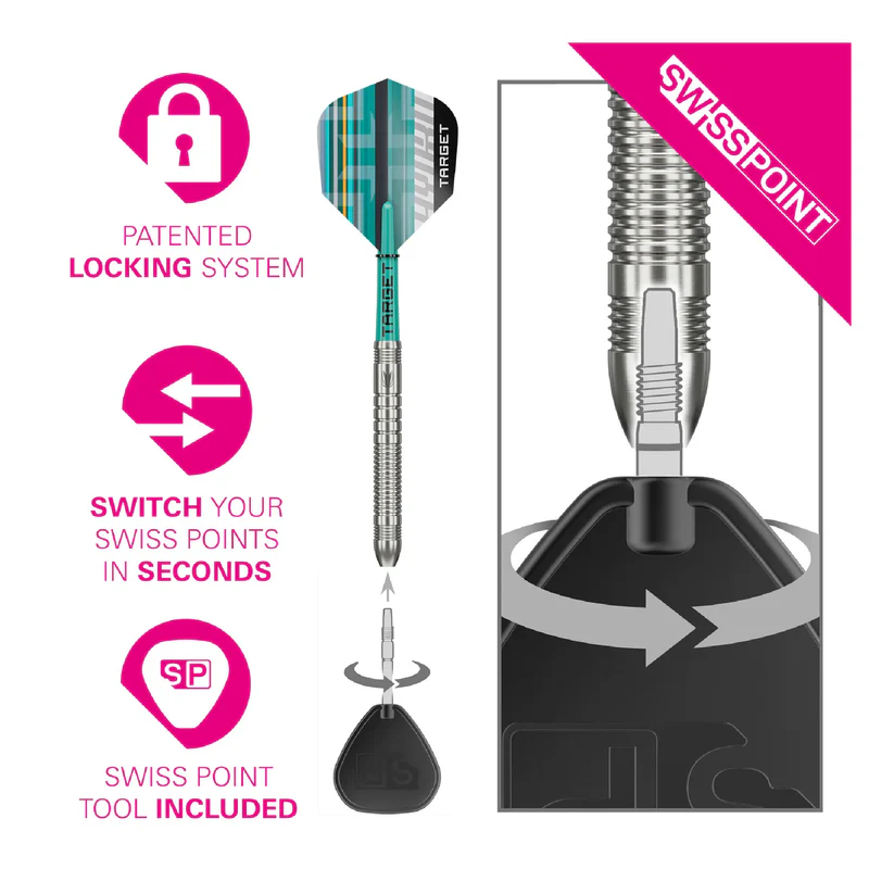 Each dart is fitted with smooth silver Swiss Points, designed with a seamless nose profile to reduce bounce-outs, and improve board hold. The Swiss Point system allows players to switch points in seconds using the included SP tool, with taper-and-thread technology ensuring a secure, locked-in fit for every throw.