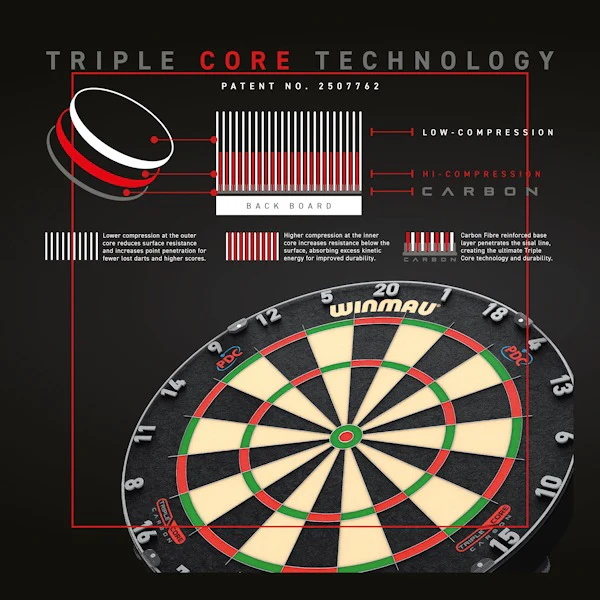 The Triple Core Carbon features an all-new patented system with a seamless playing surface and a third, high compression layer, with carbon fibre reinforced sisal. The ultimate in dartboard construction, providing optimal fibre density, unrivalled dart retention and maximum scoring.
