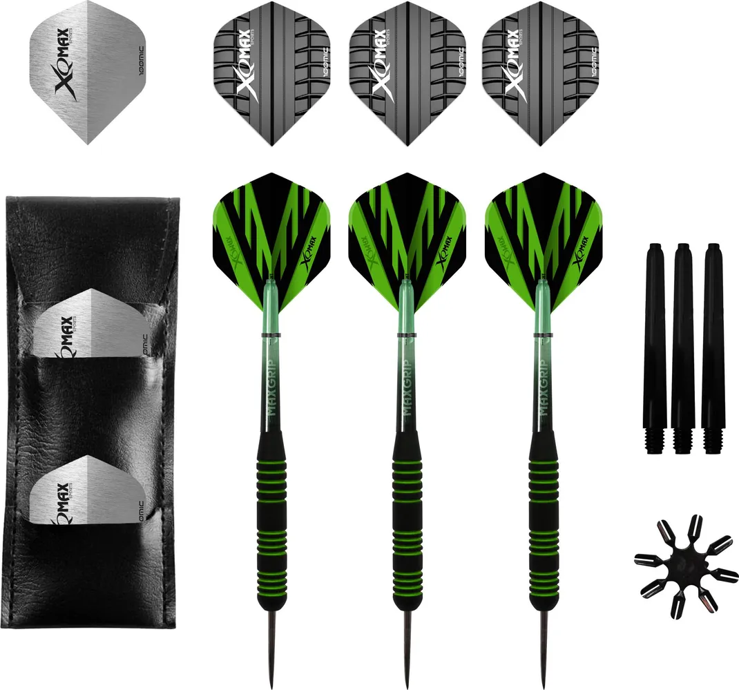 The XQMax dart set, 21 pieces, combines performance and style, featuring a sleek black design with green stripes and a range of accessories for customization. Ideal for players who want a complete, ready-to-use dart kit. Black with green stripes 23 grams rubberised steel darts set with 3 pcs XL shafts, 3 pcs black/green max grip shafts with rings, 3 sets of 3 XQ-Max flights. 8 psc flight protectors and a black dart etui.